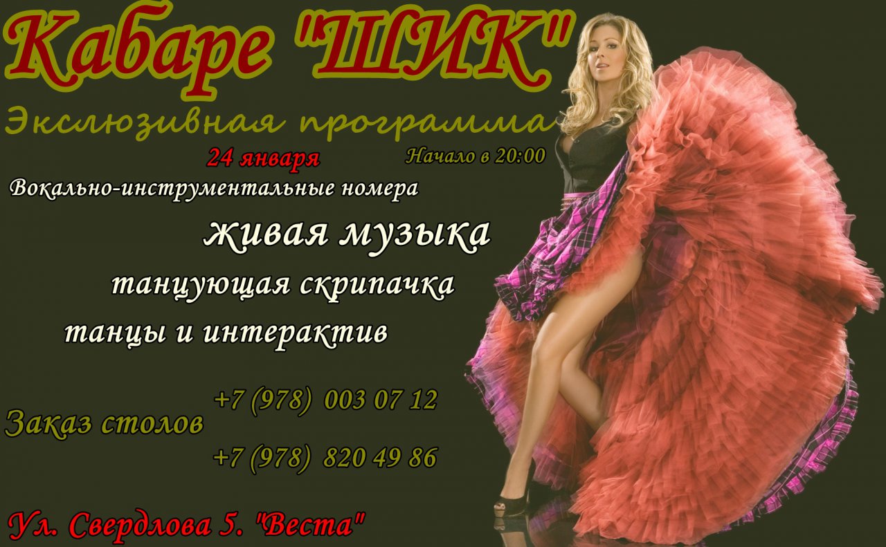 Приглашаем Вас на эксклюзивную ШОУ-ПРОГРАММУ творческого объединения "ШИК". Вокально-инструментальные номера, танцы, живая музыка, танцующая скрипачка и интерактив.
