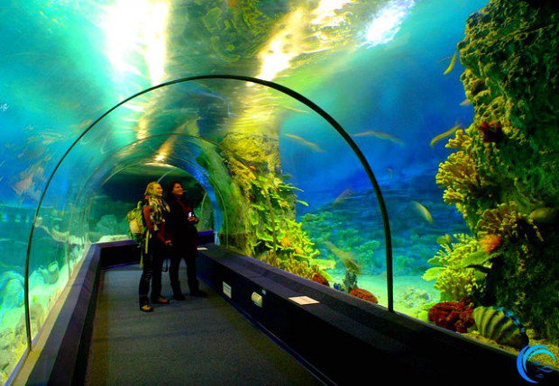 В зале для обитателей морей и океанов установлено 13 огромных аквариумов и 44-метровый изгибающийся тоннель, прозрачные коридоры которого проходят сквозь огромный аквариум с водоизмещением более 3 миллионов литров!