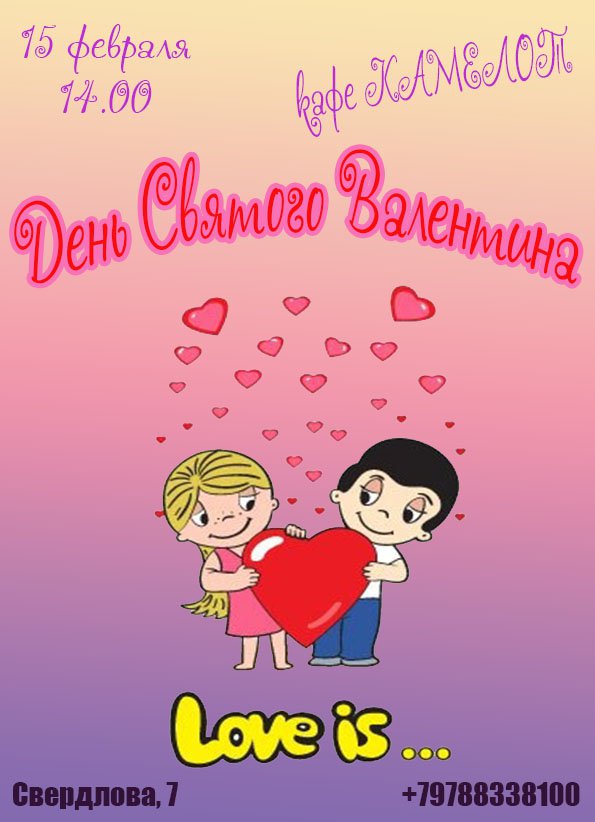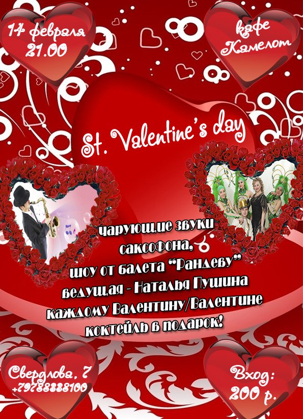Кафе «Камелот» приглашает всех отметить самый романтический праздник в году – День Влюбленных! Уютная атмосфера нашего зала создаст Вам романтическое настроение и позволит насладиться присутствием любимого человека, а наша праздничная программа не даст Вам заскучать! Позвольте себе насладиться приятным вечером и оставить хорошее впечатление на весь год! Каждому Валентину/Валентине – коктейль в подарок!
