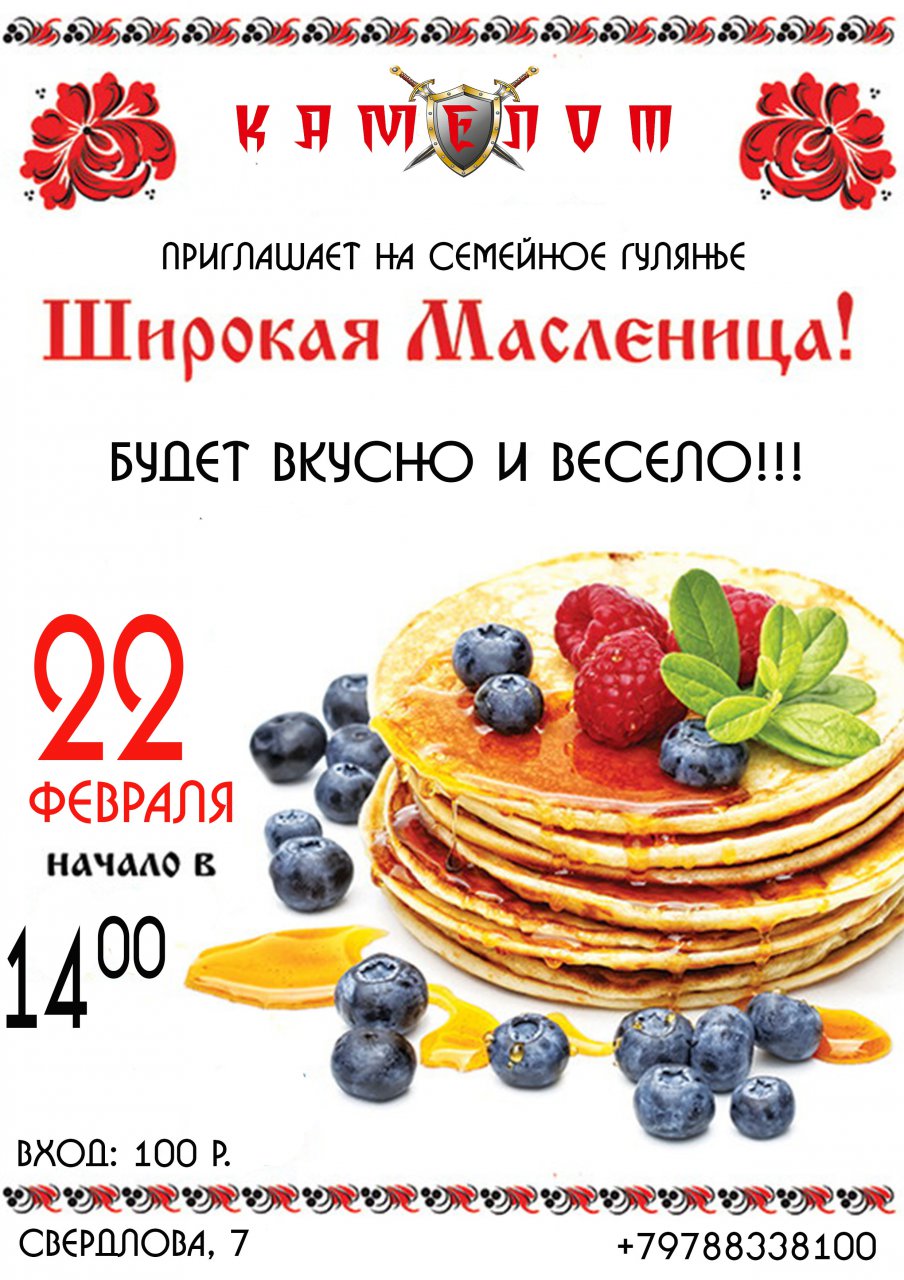 22 февраля в 14.00 приглашаем на семейное гулянье "Широкая Масленица"! Сказочные персонажи, фольклорный ансамбль, масса угощений и сюрпризов для детей и взрослых, праздничный фейерверк и сжигание чучела Масленицы!