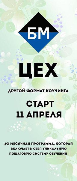 http://molodost.bz/coaching/?partner_code=ID39 - «ЦЕХ». Главный продукт БМ. 2-ухмесячный практикум по созданию и развитию своего дела. Старт 11 апреля. Занятия в основном проходят по субботам на протяжении 2-ух месяцев с 12.00 – 20.00 (с перерывом на обед).