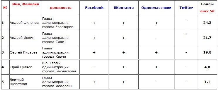 Рейтинг активности глав городских администраций Республики Крым в социальных сетях