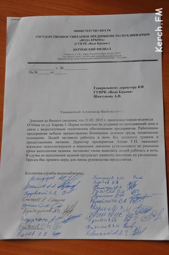 Также коллектив отметил, что директор предприятия, в случае невыполнения задания, предлагает написать заявление на увольнение. У рабочих предприятия пожелание - смена руководителя предприятия. Коллектив написал письмо на имя генерального директора предприятия «Вода Крыма».