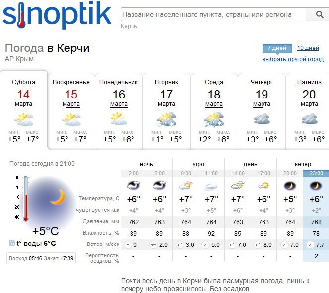 В Керчи 15 марта переменная облачность, возможен небольшой дождь. Ветер северо-восточный 12-17 м/с, утром и днем местами до 20-25 м/с. Температура воздуха ночью +1…+3, днем +6…+8.
