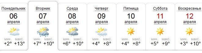 Температура воздуха днем, 7 апреля, составит +10-+15, а 8 и 9 апреля от +4, -+9. Ночью в будние дни от +1 до +6.