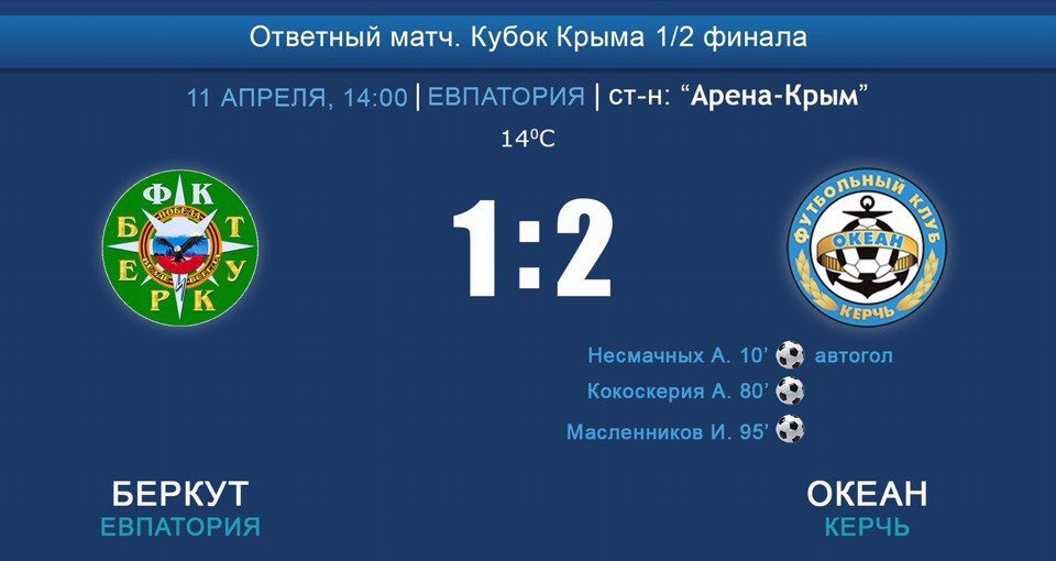 Во втором тайме керчане исправили положение и забили два мяча в ворота соперников. В итоге уверенная победа 2:1! Океан вышел в финал кубка Крыма.