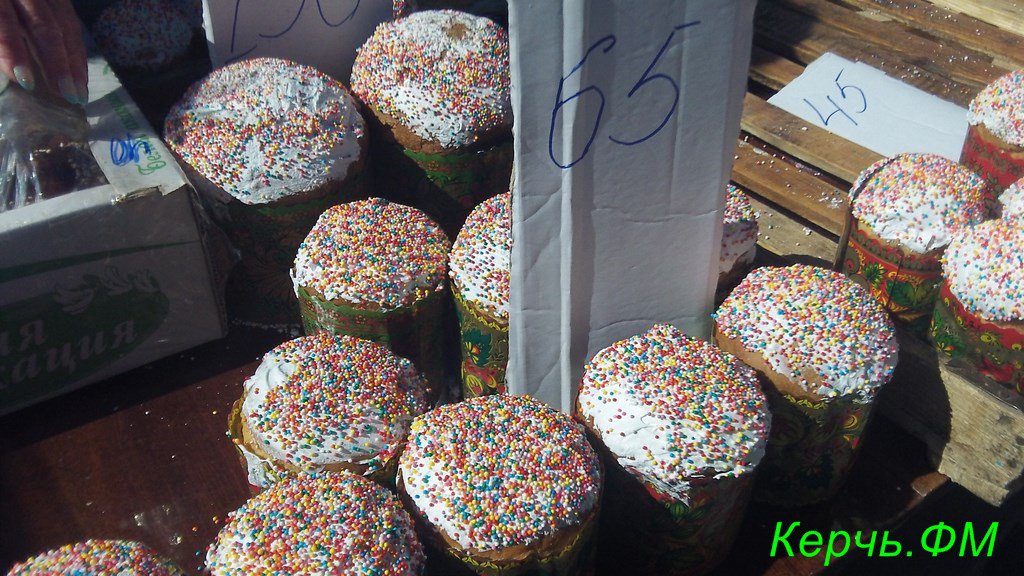 Несколько предприимчивых керчанок продают луковую шелуху. Пасхальные куличи продают во всех супермаркетах, на рынках и в магазинах. Цена от 35 руб. до 130 руб., в зависимости от размера паски.