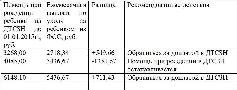 Учитывая вышеизложенное, пособие при рождении ребенка рассчитывается как разница между размером помощи при рождении ребенка, назначенной департаментом труда и социальной защиты населения (ДТСЗН) до 01.01.2015 года и выплатой ежемесячного пособия по уходу за ребенком из Фонда социального страхования.