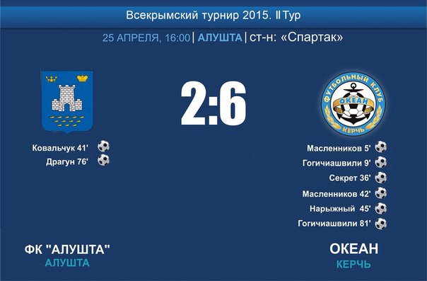 В Алуште, на стадионе "Спартак" состоялся матч II тура Всекрымского турнира по футболу. Футбольная команда "Океан Керчь" обыграла команду "Алушта" со счетом 6:2.