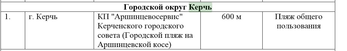 В «перечень пляжей и других мест массового отдыха людей на водных объектах, расположенных в границах муниципального образования городской округ Керчь» вошел лишь «Городской пляж» (Аршинцевская коса). При этом длина береговой линии пляжа составляет 600 метров.