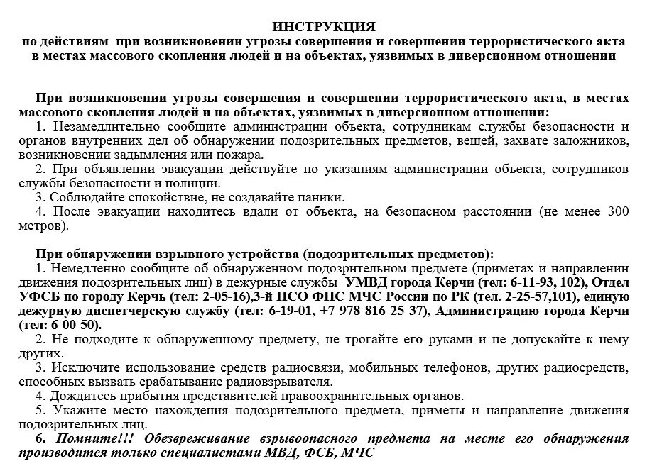 Пресс- служба администрации Керчи опубликовала разработанные для граждан инструкции при возникновении угрозы и совершении террористического акта.