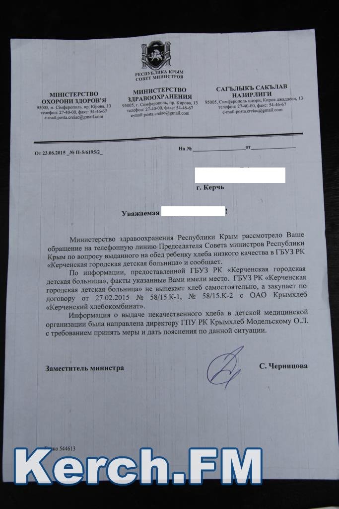 Информация о выдаче некачественного хлеба в детской медицинской организации была направлена директору ГПУ РК Крымхлеб с требованием принять меры и дать пояснения по данной ситуации.