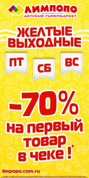 В интернет-магазине limpopo.com.ru - только 23, 24 и 25 октября дарим скидку -50% на второй товар в чеке с меньшей стоимостью. Ограничений по количеству чеков и сумме товара нет!