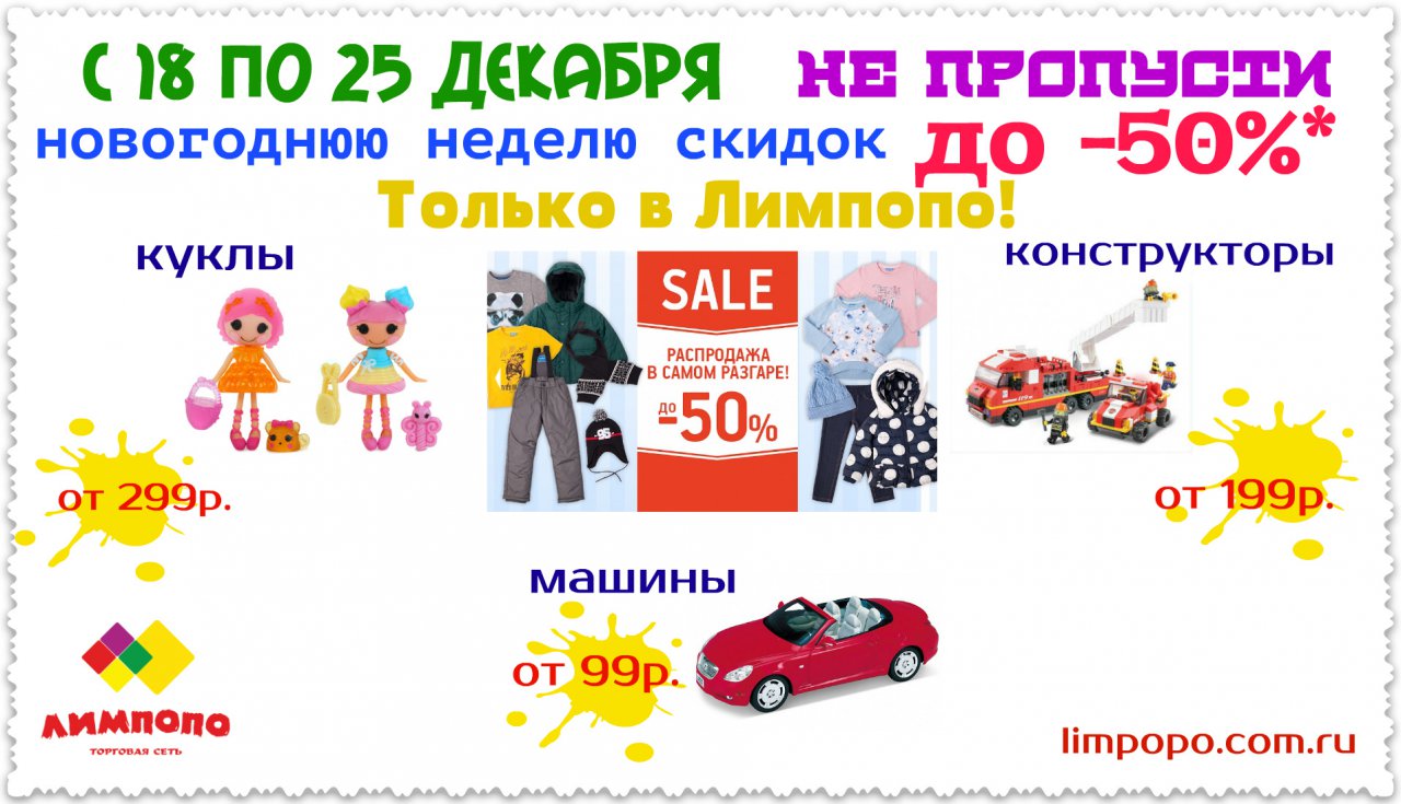 Чтобы подарки было совершать еще и выгодно, в ЛИМПОПО действуют новогодние скидки до 50%! *