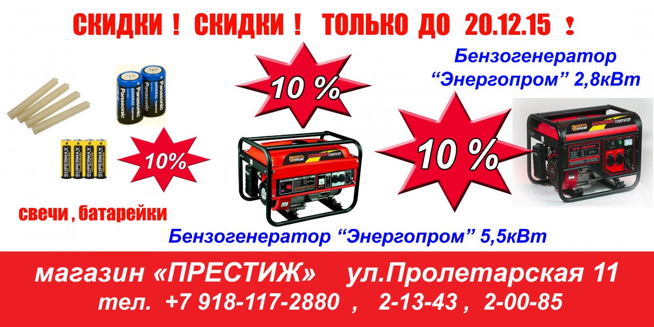 Магазин «Престиж» по ул.Пролетарская 11 только до 20.12.15 дарит скидки 10% на бензогенераторы, свечи, батарейки, фонари.