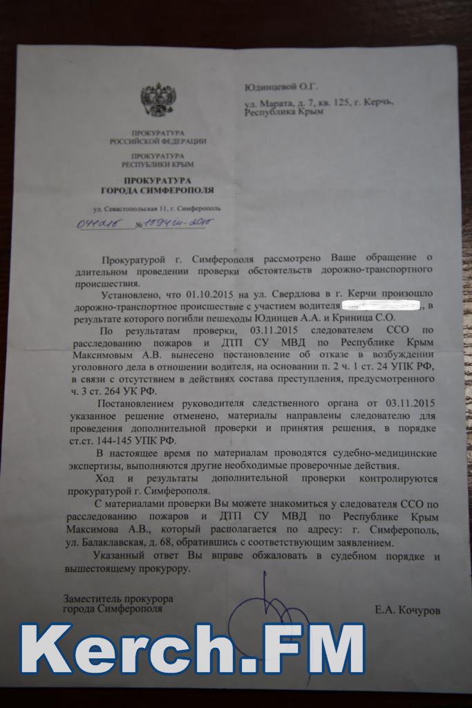 В Керчь.ФМ обратилась мать мужчины, которого 1 октября вместе с женщиной на пешеходном переходе напротив остановки "Рыбный порт" сбил автомобиль марки Опель . Женщина рассказала, что следствие стоит на месте, и в итоге виновника ДТП с ее слов не накажут.