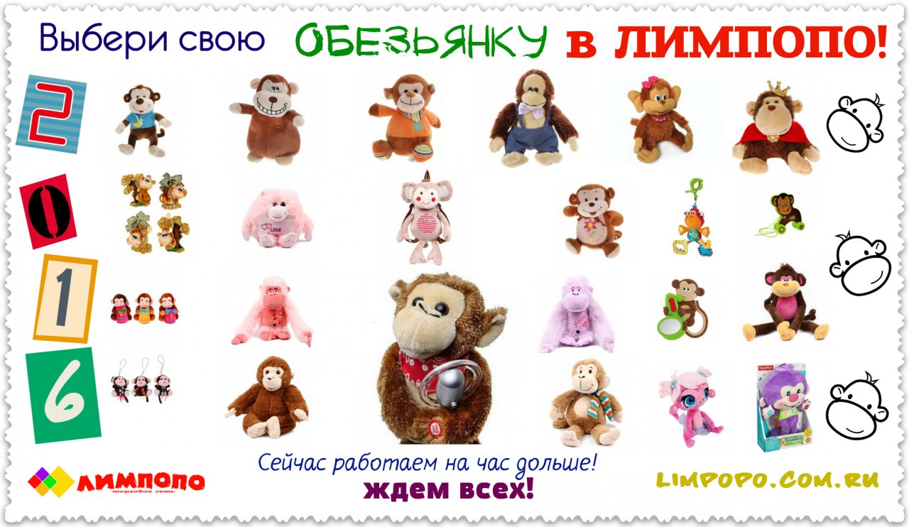 Универсальными подарками будут самокаты, ролики, велосипеды, мягкие игрушки. А также символ Нового года- обезьянка, которых в магазинах Лимпопо огромное количество!