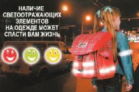 ГИБДД напоминает, что в соответствии с постановлением Правительства Российской Федерации от 14.11.2014 г. № 1197, с 1 июля 2015 года вступили в силу изменения в ПДД РФ, согласно которым при переходе дороги и движении по обочинам или краю проезжей части вне населенного пункта в темное время суток или в условиях недостаточной видимости пешеходы обязаны иметь при себе предметы со светоотражающими элементами.