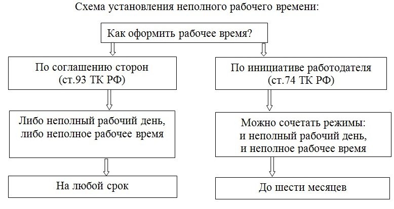 Действующее трудовое законодательство предусматривает, что согласно ст. 93 ТК РФ по соглашению между работником и работодателем могут устанавливаться как при приеме на работу, так и впоследствии неполный рабочий день (смена) или неполная рабочая неделя.