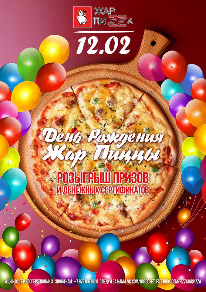 Дорогие друзья! 13 лет назад была открыта первая пиццерия "Жар-Пицца" по адресу пер. Кооперативный, 3. За это время мы заслужили ваше доверие и любовь, вы приходите к нам снова и снова, вы дарите нам свои улыбки. Пожалуй, нет в городе ни одной семьи, которая хотя бы раз не побывала в нашей пиццерии. У нас в гостях всегда много детей и мы этим гордимся!
