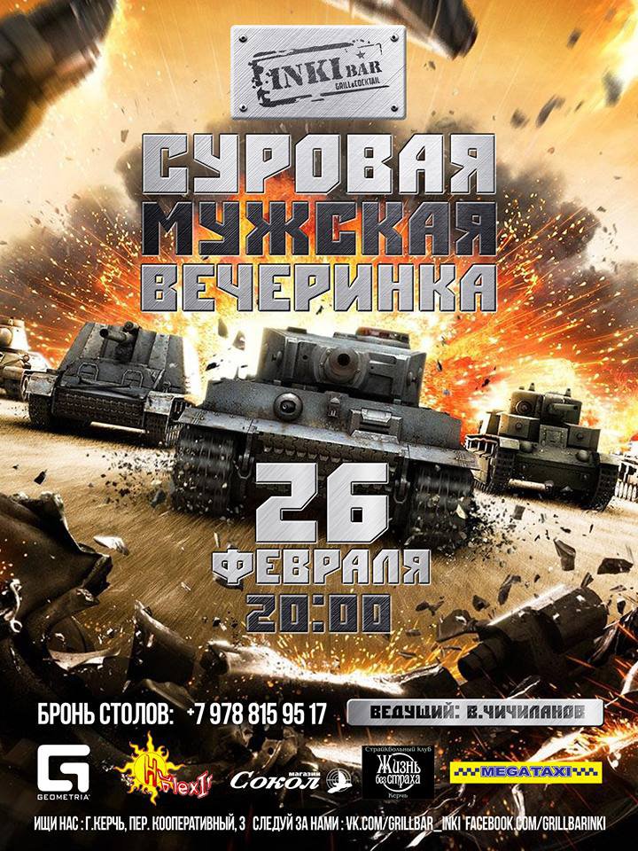26.02 Гриль - бар INKI приглашает сильную половину человечества на настоящий отдых. У нас есть все необходимое - сочное мясо на гриле, зажигательные развлечения, dj за пультом и приятные сюрпризы от наших партнеров. За настроение вечера ответственный ведущий Владимир Чичиланов.