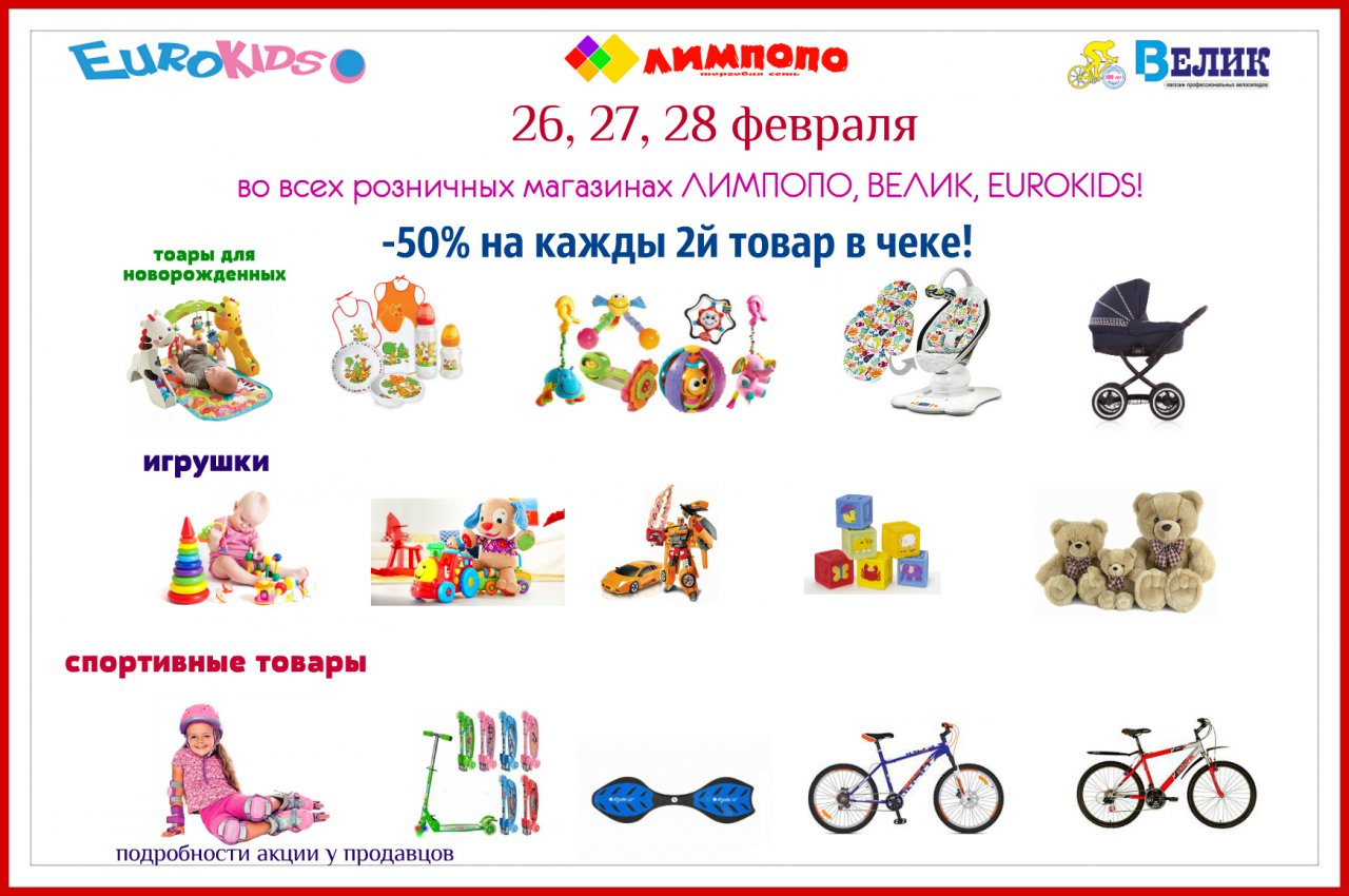 Традиционная акция -50% на каждый 2й товар в чеке действует на все категории товаров в магазинах ЛИМПОПО. Среди них товары для новорожденных, коляски, комоды, одежда, игрушки, товары по уходу за ребенком, товары для мам и многое другое.