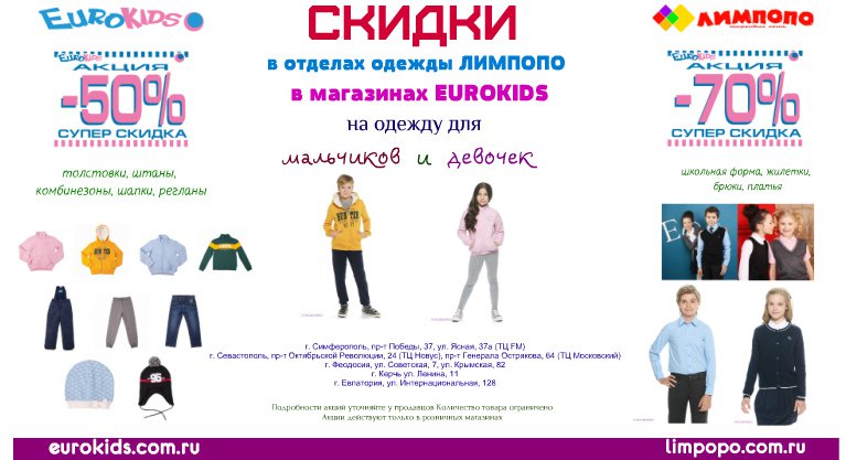 Во всех магазинах EuroKids и отделах одежды Лимпопо действуют скидки до 70%!