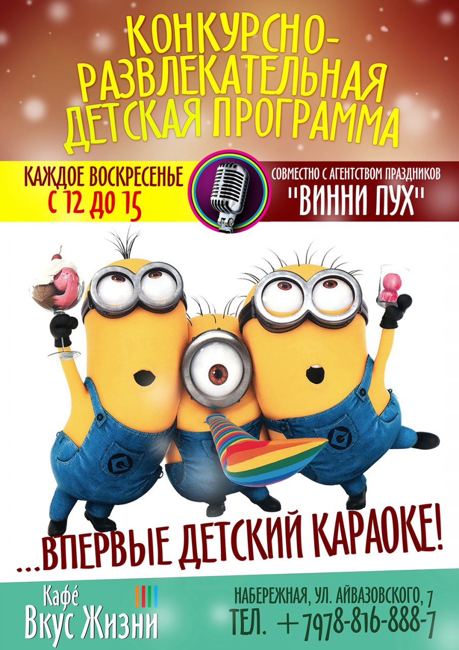 В воскресенье в Кафе Вкус Жизни ожидается нашествие «желтых»! Забавные герои известного мультфильма «Гадкий Я» пообещали показать самые весёлые банана-танцы, загадать пару увлекательных головоломок на миньонском языке, устроить интерактивные конкурсы и зажигательный ДЕТСКИЙ КАРАОКЕ!