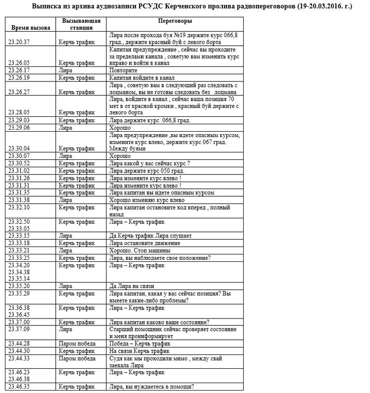 Как следует из расшифровки, в 23.20 оператор системы управления передал капитану судна курс для движения по проливу. В 23.26 из Керчи поступило первое предупреждение об отклонении от обозначенного курса и совет вернуться на него. В ответ турецкий капитан просит повторить сообщение и после этого на протяжении 3 минут не выходит на связь. За этот короткий промежуток времени оператор РСУДС продолжает давать рекомендации. «Лира», советую вам в следующий раз следовать с лоцманом, вы не готовы следовать без лоцмана, - говорит он. - «Лира», войдите в канал, сейчас ваша позиция 70 метров от красной кромки, красный буй держите с левого борта».