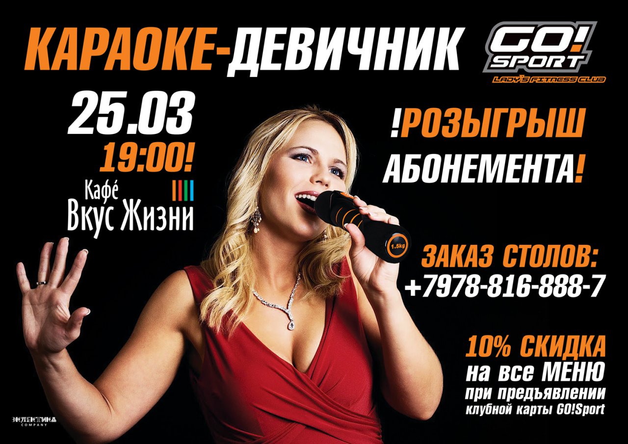 LADIES! Для Вас приятная новость! Уже на этой неделе женский фитнес клуб GO!Sport устраивает караоке-вечеринку в "Кафе Вкус Жизни". При предъявлении действующей клубной карты GO!Sport вы получаете скидку на ВСЕ МЕНЮ – 10%! И, конечно же, сюрприз вечера – розыгрыш GO!Sport-абонемента среди участниц караоке! ЖДЕМ ВАС! Заказ столов: +7-978-816-888-7. Места ограничены!