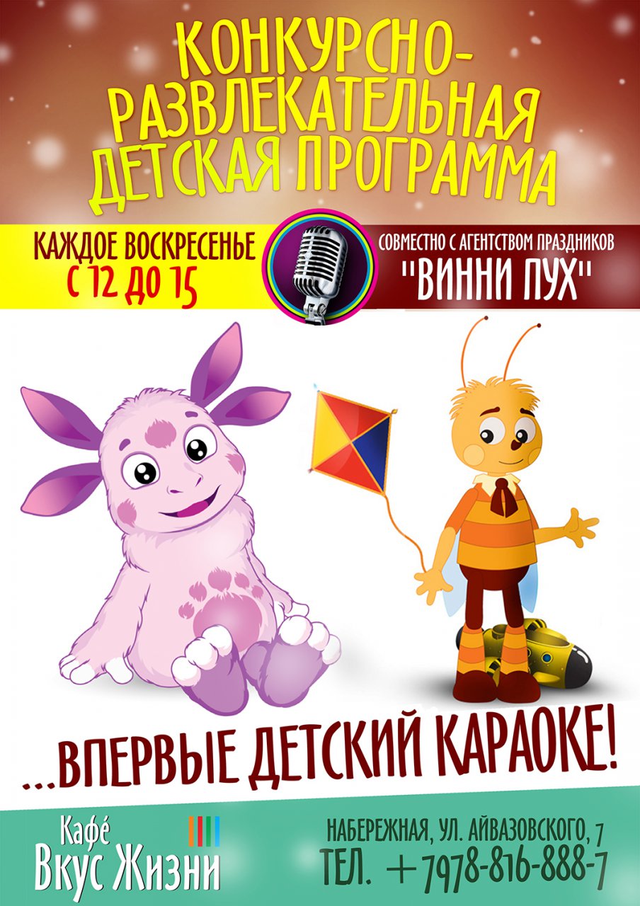 Именно для маленьких озорников мы проведем тематичную детскую программу с веселыми аниматорами агентства "Винни Пух"! Веселые конкурсы, игры, викторины, разукрашки, мультики, а самое главное - ДЕТСКИЙ КАРАОКЕ!