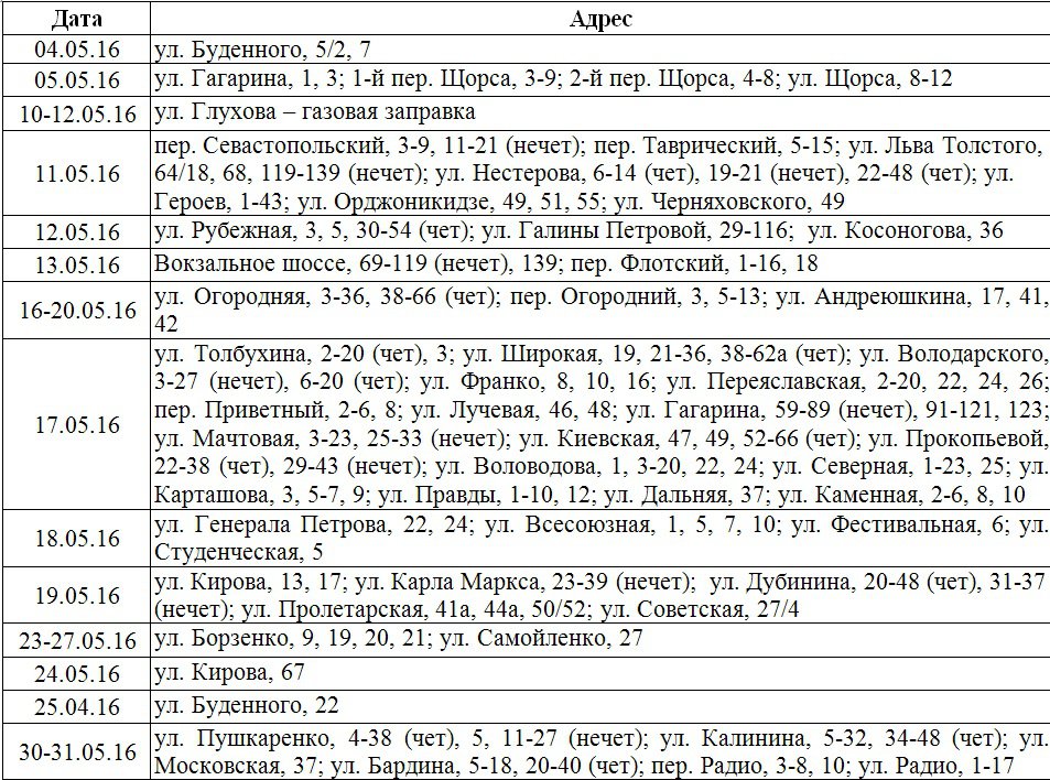 ГУП РК «Крымэнерго» сообщает о том, что в связи с плановым ремонтом электрооборудования в мае с 8 до 17 часов будут происходить отключения линий электропередачи согласно нижеприведенному графику, - передает Керчь.ФМ.
