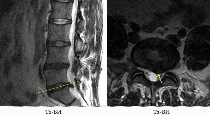 Дорзальная парамедианная левосторонняя грыжа диска L5-S1 с двусторонним сужением просветов корешковых каналов: