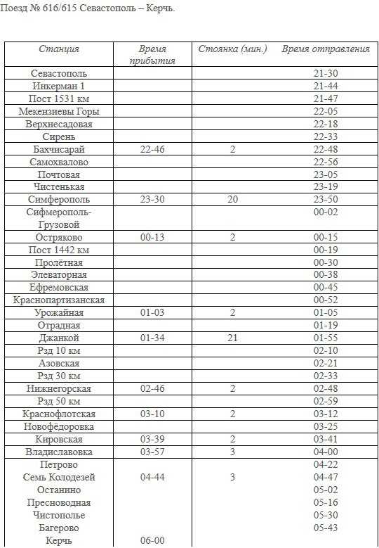 Внесены изменения в расписание движения пассажирского поезда № 616/615 Севастополь – Керчь сообщением «Севастополь – Керчь – Севастополь». Расписание вступает в силу с 29 апреля 2016 года. Об этом сообщает пресс-служба КЖД, - передает Керчь.ФМ.