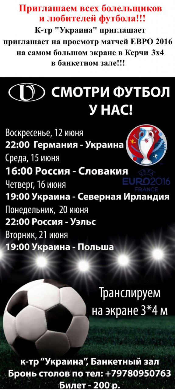 на просмотр матчей ЕВРО-2016 на самом большом экране в Керчи 3х4 м в банкетном зале!!!