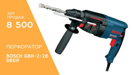 Перфоратор Bosch GBH-2-26 DRE: мощность 800 Вт, 3 режима работы (сверление, сверление с ударом, долбление), ключевой патрон в комплекте.