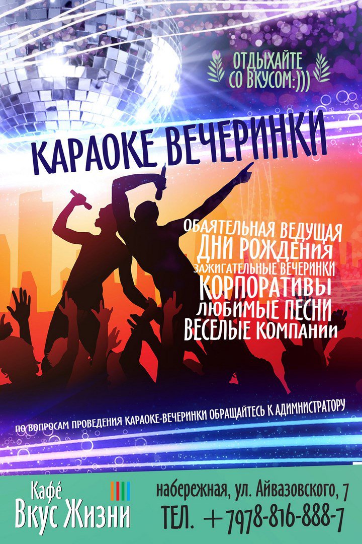Устройте себе и Вашим близким музыкальный досуг - КАРАОКЕ вечеринку!! Вспомните любимые песни и хиты, почувствуйте себя звездой, пойте дуэтами, компанией, либо устройте баттл по лучшему исполнению песен между собой, зажгите с друзьями на сцене!