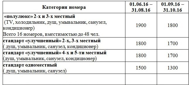 Проживание, 3-х разовое комплексное питание, автостоянка, спортивная площадка, посещение пляжа, пользование пляжным и спортивным инвентарем, мангалом, услуги аниматора.