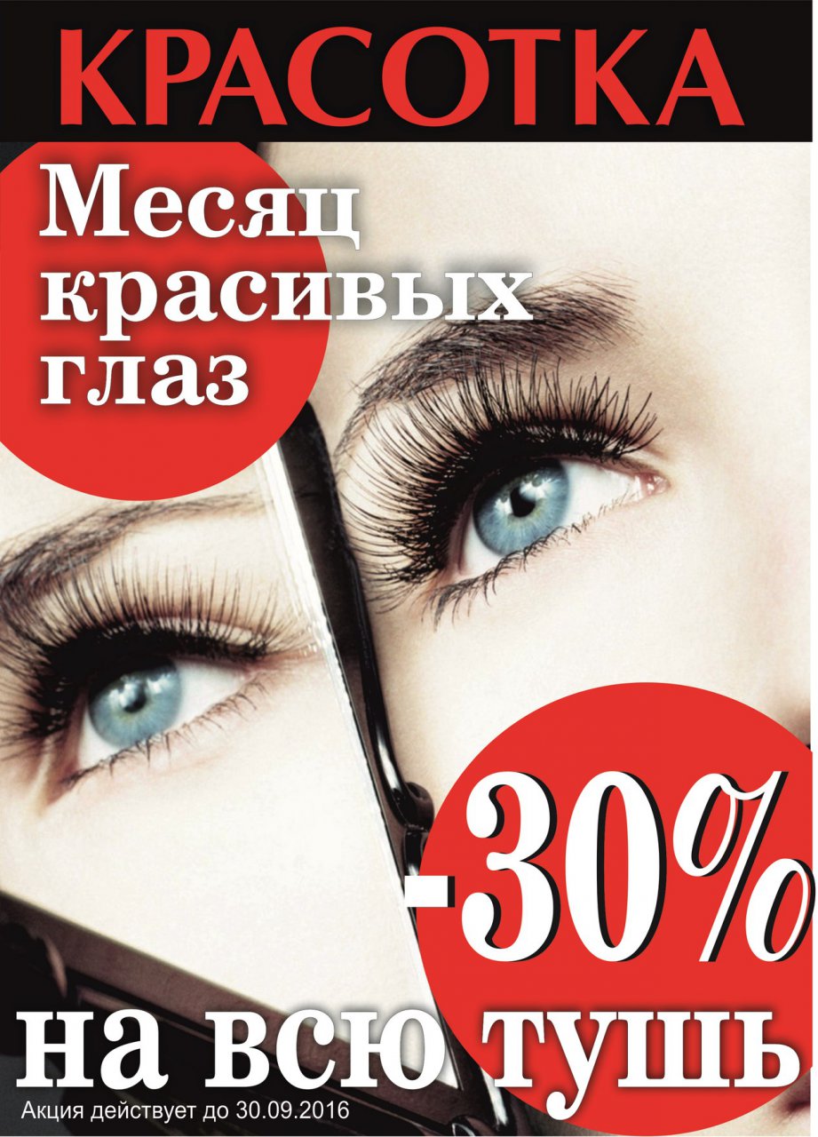 Уникальная акция сентября: «Месяц красивых глаз» - скидка 30% на весь ассортимент туши для ресниц! Спешите преобразить свой взгляд, акция действует до 30.09. 2016.