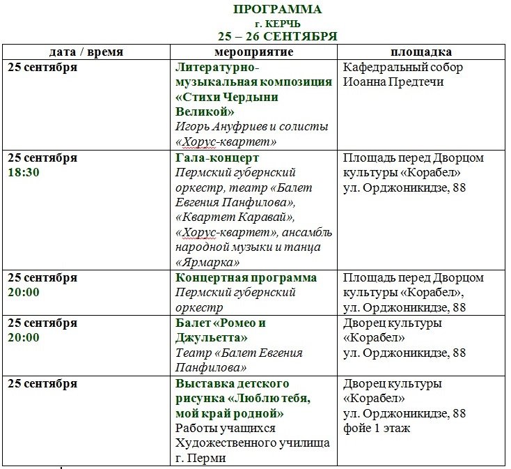 Как отмечают в пресс-службе, проект познакомит жителей Керчи с лучшими представителями искусства и культуры Пермского края. Дни культуры Пермского края откроются 25 сентября. В плане мероприятий: гала-концерт и концертная программа военного духового оркестра под управлением полковника Евгения Тверетинова.