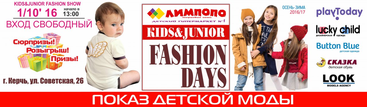 Свет софитов, красная дорожка, изысканная публика – это глобальный показ мод от гипермаркета «Лимпопо», который состоится во всех крупных городах Крыма! Маленькие модели от рождения и до 12 лет представят новые коллекции одежды и обуви «Осень-Зима 2016» от таких ведущих брендов, как Lucky Child, Button Blue, PlayToday, ТМ «Сказка».