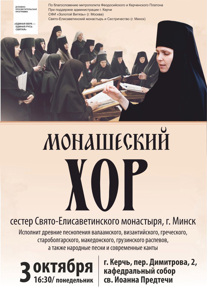 В Керчи, 3 октября выступит монашеский хор сестер Свято-Елисаветинского монастыря из Минска. Об этом Керчь.ФМ сообщили одни из организаторов мероприятия.