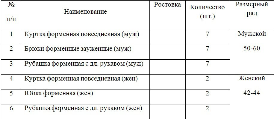 Согласно технической части вся форменная одежда прошивается по индивидуальным замерам с примерками. Размерный ряд согласовывается с заказчиком индивидуально по каждому работнику. Мужской размерный ряд от 50 до 60, женский от 42 до 44; ростовой размерный ряд от 157 см до 190 см.