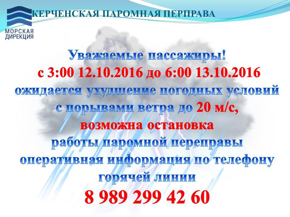 На Керченской переправе, с 12 на 13 октября ночью, ожидается ухудшение погодных условий с порывами ветра до 20 м/с. Возможна остановка паромной переправы. Об этом сообщает ООО «Морская дирекция», - передает Керчь.ФМ.
