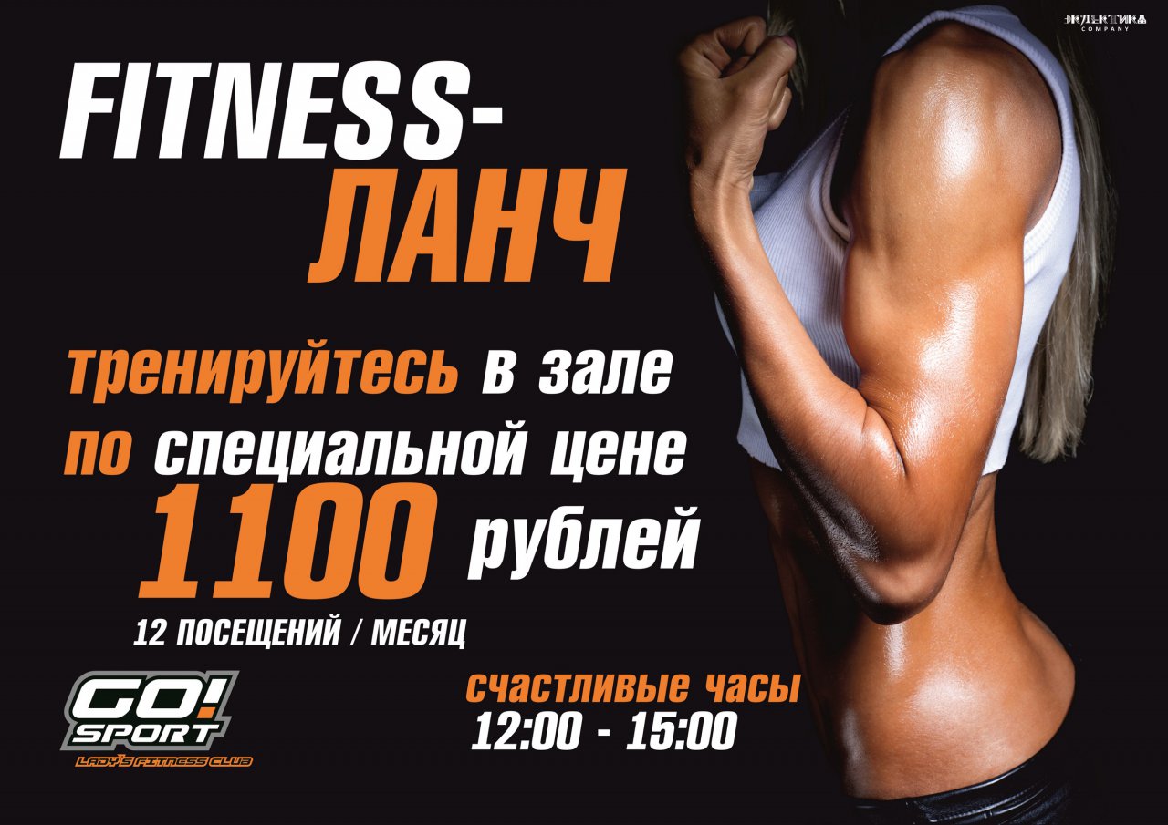 У нас действует специальное предложение - ФИТНЕС ЛАНЧ. Стоимость абонемента на 12 занятий без тренера - 1100 р. Обязательное условие - начать свою тренировку в ЛЮБОЕ ВРЕМЯ с 12:00 до 15:00. Счастливые часы в GO!Sport действуют во все рабочие дни согласно расписанию.