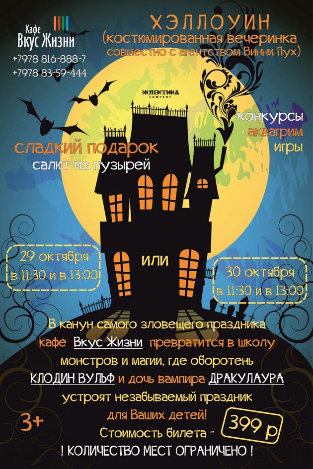 Только раз в году кафе "Вкус Жизни" наполняется загадками и тайнами, волшебством и магией. В этот раз оно превратится в школу монстров, ведьм и других героев сказок и мультфильмов. Оборотень Клодин Вульф и ее подруга, дочь коварного вампира, Дракулаура будут обучать своих учеников, играть с ними в захватывающие игры, испытывать в увлекательных конкурсах и закружат в салюте из мыльных пузырей. О многих развлечениях подружки предпочли не рассказывать, пусть это будет сюрпризом, однако о подарках они нам шепнули. Каждого маленького гостя будет ждать "сладкий мешочек", ведь какой Хэллоуин без сладостей? По желанию свой образ бесплатно можно будет дополнить аквагримом до начала праздника согласно выбранному Вами времени.