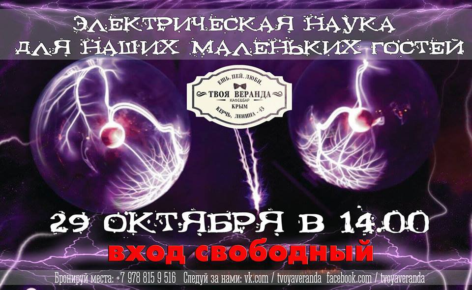 Дорогие мамочки и папочки, бабушки и дедушки 29 октября в 14.00 Твоя Веранда приглашает Вас и ваших деток на увлекательное шоу Электрической науки. Юные ученики смогут почувствовать себя настоящими учеными и физиками, увидеть опыты с электричеством, пощупать руками молнии и узнать много полезного и интересного. Скорее к нам! ВХОД СВОБОДНЫЙ. Успей забронировать места.+7 978 815 95 16