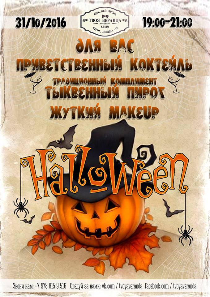 Друзья! Привыкли видеть Твою Веранду романтичной и нежной? Все меняется! Ведь 31.10.2016 Твоя Веранда празднует HELLOWEEN, а значит в этот день будет не просто красиво, а страшно-красиво. Вас ждут много угощений и комплиментов от заведения, а также, специально для всех желающих с 19-21.00 будет работать гример, который поможет создать жуткий образ.
