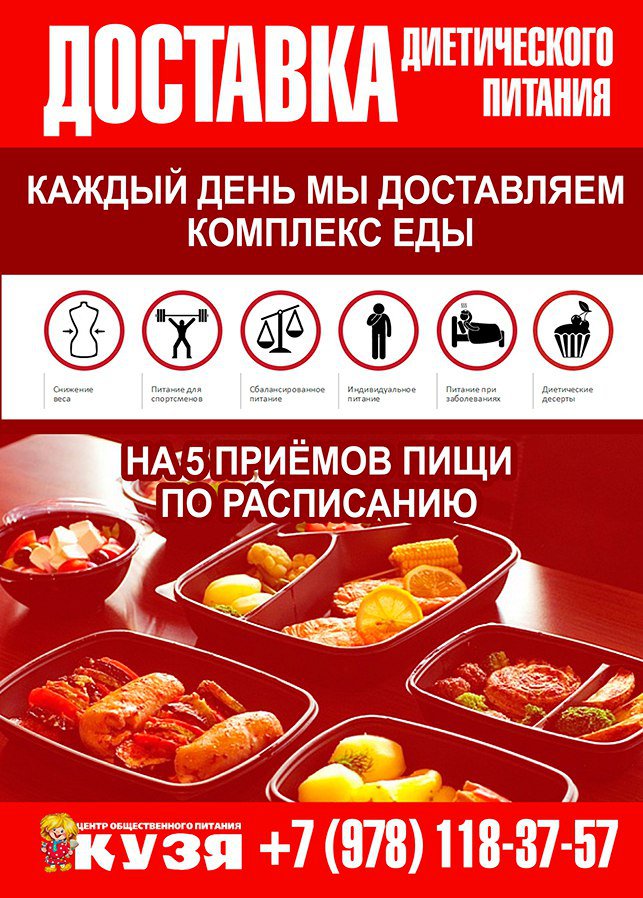 Центр общественного питания «КУЗЯ» предлагает услуги по разработке и приготовлению индивидуальных программ сбалансированного и диетического питания, а также сервис по доставке.