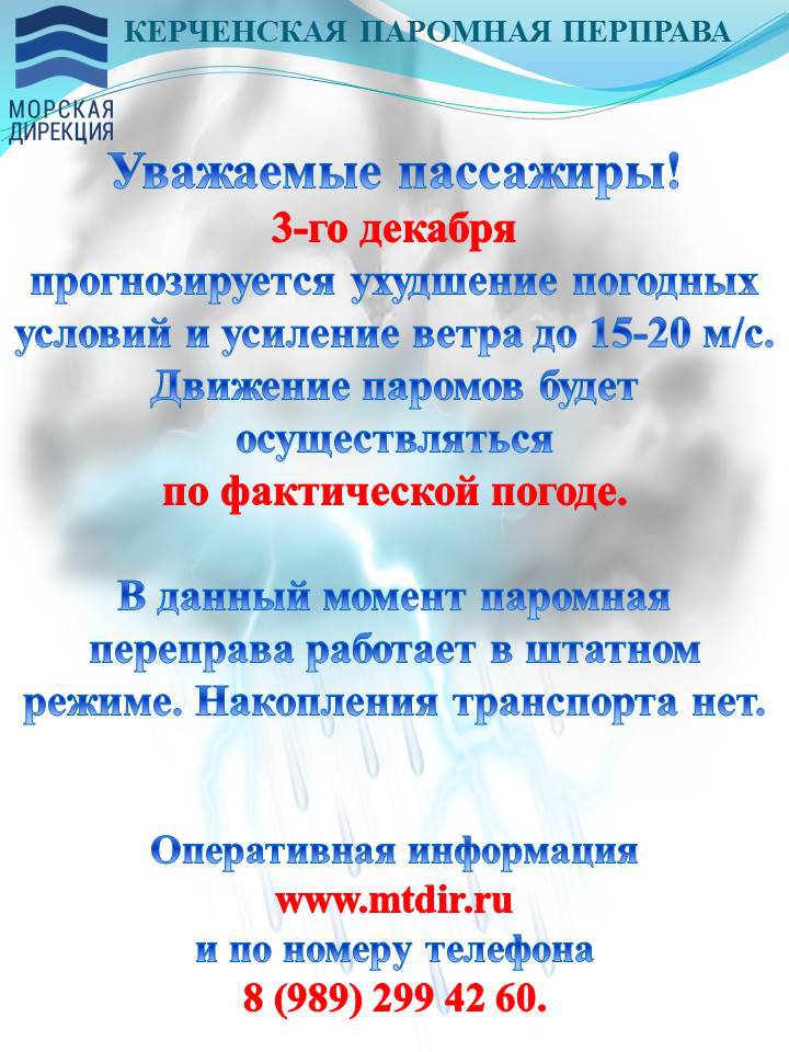 На Керченской паромной переправе, 3 декабря, ожидается ухудшение погодных условий в связи с усилением ветра до 15-20 м/с. Как сообщает пресс-служба ООО «Морская дирекция», - передает Керчь.ФМ